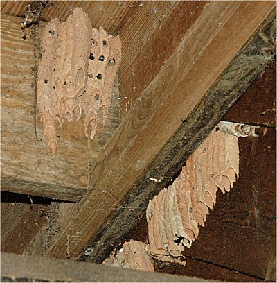 Nest: Long, thin tubes OR looks like mud was thrown at a wall and splattered.