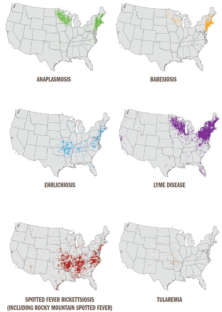 This diagram shows reported cases of each illness reported to the CDC in 2016. Each dot represents one case. As you can see, New Jersey and Pennsylvania both suffered from anaplasmosis, babesiosis, ehrilchiosis, Lyme disease, and spotted fever rickettsiosis in 2016.