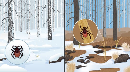 Tick activity generally decreases in the fall and winter. However, it’s not really until the first frost that ticks become less of a threat. The blacklegged tick (the tick that carries Lyme disease) is an unfortunate exception to the rule. The dangerous blacklegged tick can survive until temperatures drop below freezing. By living beneath the snow on the unfrozen ground, ticks and come out on warmer winter days. This opens up the possibility for tick bites and disease transition to humans and pets spending time outdoors.