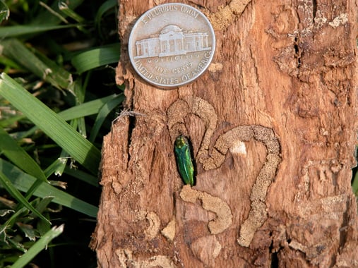 Emerald ash borers (EAB) are shiny emerald in color. Adult bodies are 3/8 – 1/2 inch long and 1/16 inch wide. Surprisingly, adults cause little damage to ash trees other than chewing on their leaves. The most destructive phase in the lifecycle is the nearly invisible one: larvae. Emerald ash borer eggs are laid beneath the surface of ash tree bark, chewing galleries through the tree and causing irreversible damage. The larval state lasts 1-2 years before they emerge through signature D-shaped holes to mate. This means at least one year of damage occurs beneath the surface of the tree’s bark.