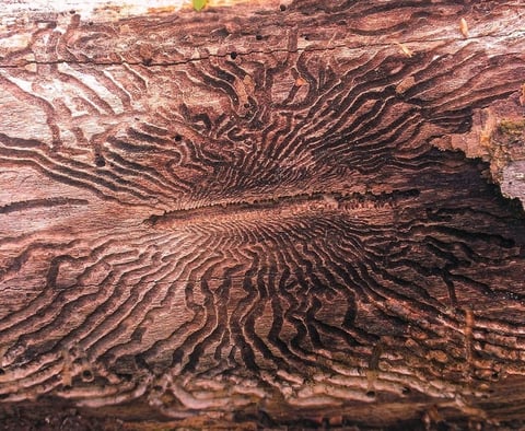 Pictured Above: Galleries created by emerald ash borer larvae under the bark of an ash tree