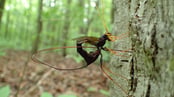 Black giant ichneumon wasps are large flying insects that rest on trees throughout the central and northern United States. You may have noticed them perching on tree bark around your property. Although they are 1.5 inches long with a 5 inch long ovipositor, these wasps are not dangerous as their size may lead you to believe. Their long ovipositor is often mistaken for a stinger on this big wasp. In reality, it's a tool that black giant ichneumon wasps use to inset their eggs into pigeon horntail wasp nests within trees.