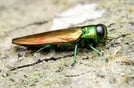 Emerald ash borers () are shiny emerald in color. Adult bodies are 3/8 – 1/2 inch long and 1/16 inch wide. Surprisingly, adults cause little damage to ash trees other than chewing on their leaves. The most destructive phase in the lifecycle is the nearly invisible one: larvae. Emerald ash borer eggs are laid beneath the surface of ash tree bark, chewing galleries through the tree and causing irreversible damage to ash trees across the country. The larval state lasts 1-2 years before they emerge through signature D-shaped holes to mate.