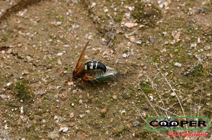 - Color: Cicada killers are big wasps with orange wings and a black body marked with horizontal yellow bands. Their unique coloring sets them aside from other flying pests that nest in the ground.