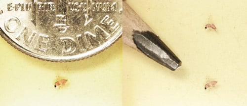 Biting midges, punkies, or no-see-ums are very tiny (less than 1/4-inch long), slender gnat-like flies. Some have narrow spotted or clear wings. Larvae are tiny, whitish, elongate, or worm-like, and are found in sand, mud, decaying vegetation, and water in tree holes.