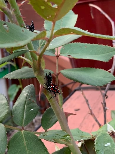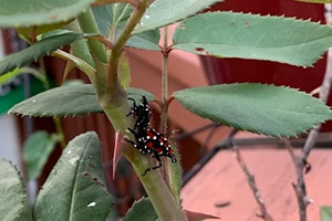Once spotted lanternflies hatch from their eggs, they emerge in the nymph stage. They are black or red with white polka dots and roughly between ¼-½ inch long.